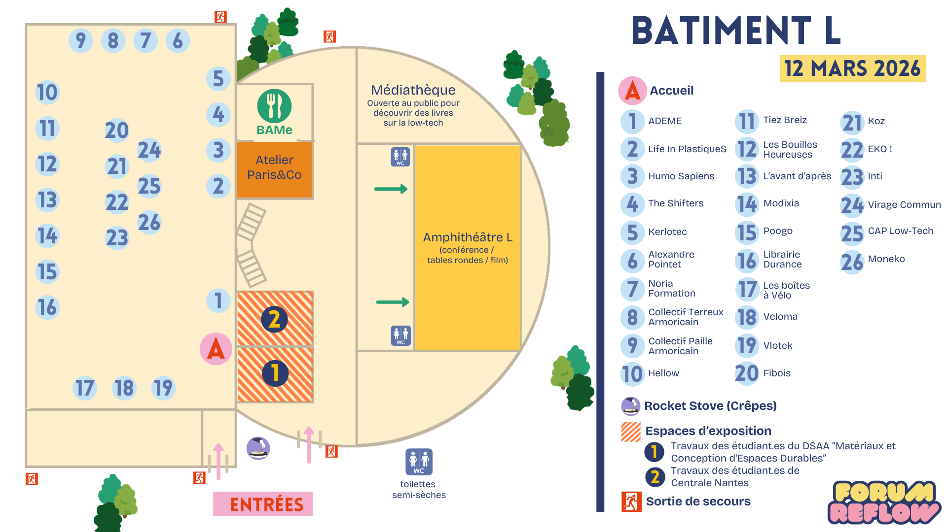 Vous êtes perdu.es dans le bâtiment L ? Vous voulez trouver un stand particulier ? Jetez un œil à ce plan pour (re)trouver votre chemin !