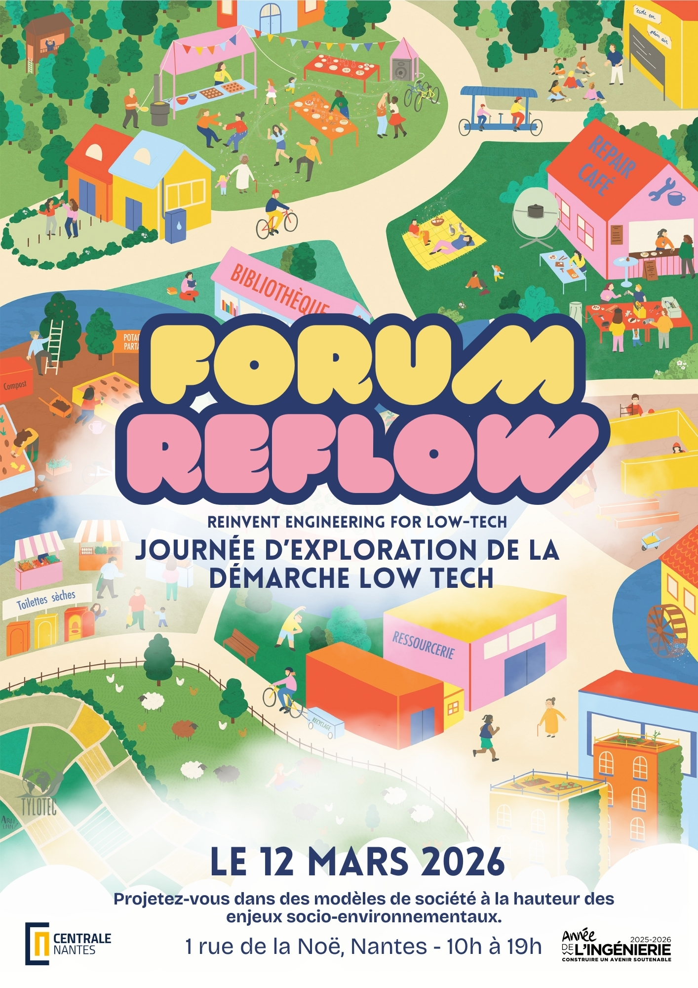 Pourquoi REFLOW ? Pour Reinvent Engineering For Low-Tech, Reinvent Engineering étant le slogan de l'école Centrale de Nantes. Organisé par des élèves ingénieur.es, le forum REFLOW est l'occasion de remettre en question la place de l'ingénieur dans les enjeux sociaux-environnementaux.